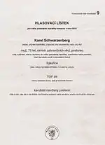 - ↑ Danda, Oldřich. "Schwarzenberg hodil do urny lístek bez obálky, jeho hlas neplatí". Novinky.cz. Retrieved 25 January 2013.