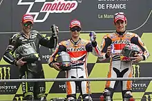 Cal Crutchlow, Dani Pedrosa and Marc Márquez, celebrating on the podium after finishing second, first and third in the MotoGP race.