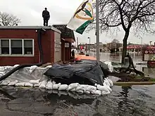 In Clarendon Hills, homes and yards sustained "devastating" damage,[29] while in downtown Naperville, streets were flooded and schools were cancelled the next day on April 19 because of flooding concerns.[30][17] A branch of the DuPage River spilled over a levee protecting the river flooding, and a hospital in Morris evacuated 44 patients after floodwaters entered the basement of the hospital.[31] In Utica, a mobile home park was evacuated, while water rescues were conducted in Marshall County.[31] A levee breached in Lincolnshire, prompting 49 homes to be evacuated, and in Marseilles, 1,500 people were evacuated after a compromised levee flooded homes and infastructure.[26] Several homes were also evacuated in London Mills as numerous homes were inundated by floodwaters.[26] Several streets and a parking lot at Scott Air Force Base was flooded.[32][33][34] In Peoria, the city broke their 24-hour rainfall record, while Galesburg set a daily rainfall record on April 18, with 4.16 inches (106 mm).[3]