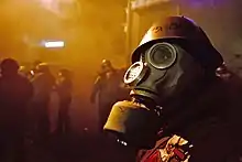Clashes began as thousands descended upon parliament via Hrushevskoho Street, and were met by police cordons, and a blockade of military cars, mini-vans and buses.[19][20] Police warned over loudspeaker, stating, "Dear citizens, your actions are illegal and are against the state." They also warned that advancing within three meters of police would be considered a threat to police officers' rights and will prompt a response.[19] Tensions eventually developed, and the sides exchanged projectiles as protesters attacked the police barricade armed with sticks, pipes, helmets, and gas masks. They were met with stun and smoke grenades.[21][22]
