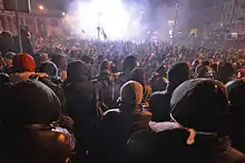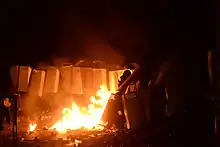 Police fired rubber rounds against journalists and cameramen that were present, and continued to throw molotov cocktails at protesters.[59] Eyewitnesses said police were firing indiscriminately with rubber and regular bullets into the crowd periodically throughout the day, striking an unknown number of people.[60] Hundreds were injured, and significant damage was done to cars on the scene that were set ablaze as in previous days. Journalists found numerous ammunition shells on the ground. Police and medics confirmed live rounds were used in the shooting deaths of two protesters earlier in the day.[57][59][61] The prime minister denied that the police carried live ammunition. The co-ordinator of the protesters' medical corps said that five people had been killed, four from gunshot wounds and one in a fall.[61] About 100 meters behind the front line, protesters erected a secondary barricade using cement planters and steel ripped from massive billboards, to slow police if they tried to chase protesters back to the square again.[62] By evening 300 were injured and 4 dead by police gunfire.[63]