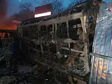 Opposition leader Vitali Klitschko (who attempted to bring calm)[nb 1] was sprayed with a fire extinguisher by a protester from the crowd, and shouted down as a traitor. Following this, live TV pictures showed protesters attempting to overturn a bus used by police, which was later set on fire after petrol bombs were thrown.[20] At least three buses were overtaken by demonstrators.[19] Water cannons used to douse the flames were also directed at protesters; an illegal use of force due to freezing temperatures.[19] Later, rubber bullets were used against protesters as more police vehicles were set ablaze.[19][24] Up to 10,000 protestors remained near the Valeriy Lobanovskyi Dynamo Stadium by 10 p.m. as clashes continued with smoke filling the air from the burning vehicles.[19] The entire line of police buses used in the blockade was set on fire,[25] and as midnight approached, nearly everything in the square by the Dynamo Stadium was burning.[26] Commenting on the situation, opposition MP Lesya Orobets stated, "War has finally started, laws don't apply anymore."[26] Reports from Lviv indicated that demonstrators in Lviv, Kalush, and Ivano-Frankivsk blocked military units from deploying to Kyiv;[19][27][28] with a similar situation occurring in Rivne, blocking Berkut troops.[29] Lviv troops later thanked protesters for blocking their deployment.[30] Automaidan activists by 3 a.m. blocked all roads exiting Yanukovych's Mezhyhyria mansion.[19] In the early morning, protesters in central Kyiv continued supplying molotov cocktails and advanced on police cordons while fortifying barricades to their rear as police continuously used water cannons, fired rubber bullets, and jammed cell phone signals.[31]