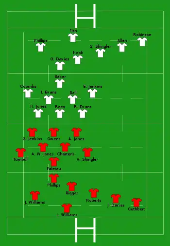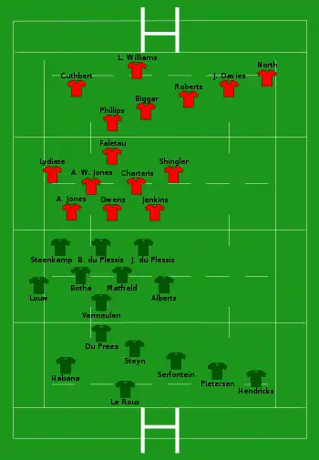 | Try: J. Williams (2) 2' m, 79 c Biggar 5' c J. Davies (3) 23' c, 25' c, 46' c L. Williams 35' m Baldwin 43' c Con: Biggar (6/8) 6', 24', 26', 44', 47', 80' Pen: Biggar (1/1) 12' | Report[11] | Try: G. Davies 60' c Con: Hook (1/1) 60' |