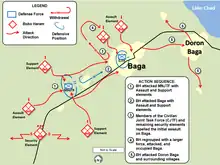 In the days following the assault, the militants forced Baga's residents into the surrounding area villages.[4] On the evening of Tuesday, 6 January, two local residents reported that the militants began to burn local buildings using petrol bombs and explosives, and according to survivors proceeded to kill those left.[4][5] On 9 January, a resident described the extent of the damage by reporting, "There is not any single house that is standing there."[11] According to Musa Bukar, head of the Kukawa local government area, all 16 villages in the LGA were razed as well, and their residents either killed or forced to flee.[2]