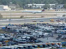 Daytona International Speedway is a race track in Daytona Beach, Florida, United States. Since opening in 1959, it has been the home of the Daytona 500, the most prestigious race in NASCAR.[10] In addition to NASCAR, the track also hosts races of ARCA, AMA Superbike, USCC, SCCA, and Motocross. The track features multiple layouts including the primary 2.5 mi (4.0 km) high speed tri-oval,[11] a 3.56 mi (5.73 km) sports car course, a 2.95 mi (4.75 km) motorcycle course, and a .25 mi (0.40 km) karting and motorcycle flat-track. The track's 180-acre (73 ha) infield includes the 29-acre (12 ha) Lake Lloyd, which has hosted powerboat racing. The speedway is owned and operated by International Speedway Corporation.