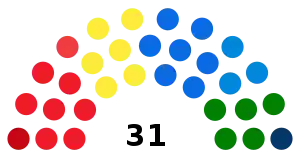 The Regional Council of Liguria is composed of 30 members, plus the president elect. The president elect is the candidate winning a plurality of votes at the election. Within the council, 24 seats are elected in provincial constituencies by proportional representation. The remaining 6 councillors are assigned as a majority bonus if the winning candidate has less than 18 seats, otherwise they are distributed among the losing coalitions.[2]