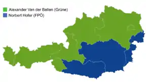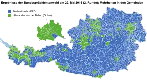- ↑ "Bundespräsidentenwahl 2016 – 2. Wahlgang – Vorläufiges Gesamtergebnis inklusive Briefwahlstimmen". Bundesministerium für Inneres (in German). 23 May 2016. Retrieved 24 May 2016.