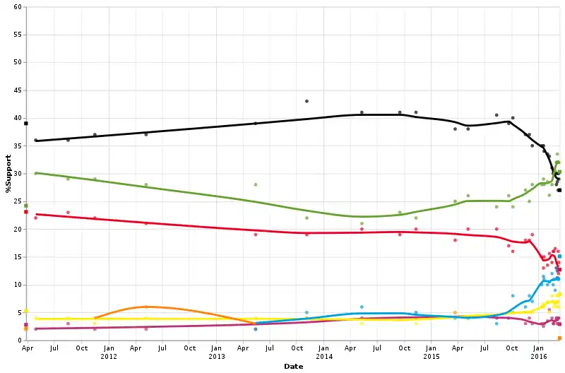 | YouGov | 2–9 Mar 2016 | 974 | 30 | 32 | 12 | 8 | 4 | – | 11 | 3 | 2 |