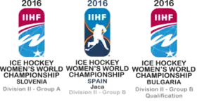The 2016 IIHF Women's World Championship Division II was three international ice hockey tournaments organised by the International Ice Hockey Federation. The Division II Group A tournament was played in Bled, Slovenia, from 2 to 8 April 2016,[1] the Division II Group B tournament was played in Jaca, Spain, from 29 February to 6 March 2016,[2] and the Division II Group B Qualification tournament was played in Sofia, Bulgaria, from 7 to 10 December 2015.[3]
