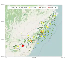 | 14 November 2016 | 00:24:17 | 5.6 | 12 km (7 mi) | 40 km north of Kaikōura | [109] |