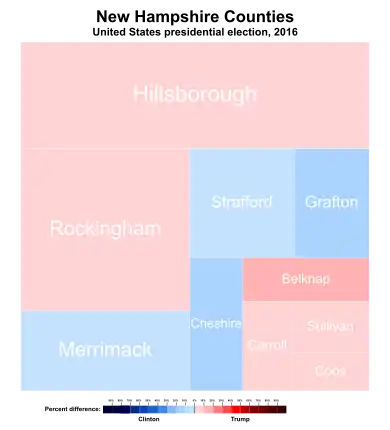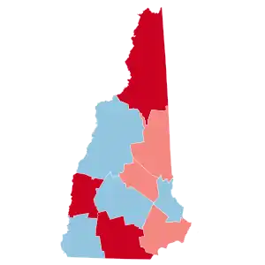 Hillary Clinton's margin of victory was the smallest for a Democrat in the state since Woodrow Wilson narrowly won it in 1916. New Hampshire last voted for a Republican, George W. Bush, in 2000, and although Trump did not win New Hampshire, the top-line county results were exactly the same in 2000 and 2016. Despite Trump's narrow loss, this would be the first and only presidential election since 2000 where New Hampshire would vote more Republican than the national average, when the Republican candidate won more of the state's counties, along with the first time since 1976 when the winner of Coos County did not also carry the state as well. Coincidentally, New Hampshire voted as Republican in 2016 as it did Democratic in 2012 and 2020 in comparison to the rest of the nation.