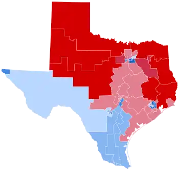 While he continued the Republican 10-cycle winning streak in Texas,[38] Trump's winning margin was down from Mitt Romney's 16% in 2012 to 8.99%, a 7.01% drop, making 2016 the closest Democrats had come to winning Texas since 1996 (though the Democrats also received a smaller percentage of the vote in Texas in this election than in the 2008 presidential election). The surge in Democratic votes can partly be attributed to a growing population of Hispanics/Latinos, Trump's relatively weak performance with college-educated white voters, and the growth of cities and their respective suburbs in the Texas Triangle region, which are heavily populated with both college-educated voters and minorities and thus swung more Democratic compared to 2012.[39] These were Clinton's main sources of votes. She swept the Rio Grande region counties, such as El Paso, Webb, Hidalgo and Cameron as they have sizable Hispanic populations. Clinton scored a 38-point sweep in Travis County, home to the state capital and heavily liberal city of Austin, the best Democratic performance in the county since 1964. She became the first Democrat to break 60% of the vote in Dallas County since 1944. Furthermore, she outperformed Obama in the minority-heavy counties of Bexar (San Antonio) and Harris County (Houston), shifting his slim victories into double-digit leads.[40] In fact, the Presidential vote in Texas' 7th Congressional District, which includes Houston's inner-west suburbs, had the biggest change in margin towards Clinton compared to Obama's 2012 performance outside of Utah, shifting 23 points left.[41] Clinton also won suburban Fort Bend County for the first time since Texas native Lyndon B. Johnson in 1964, which was attributed to the county's large immigrant population and negative perception of Trump by female Republican voters.[42] While Clinton didn't win suburban counties such as Denton County, Williamson County, Collin County, or Hays County, her margin of defeat was much narrower than other Democratic presidential nominees. Trump on the other hand narrowly flipped Jefferson County in East Texas, becoming the first Republican since Richard Nixon in 1972 to win the county.[43] Places that had large numbers of young voters in the state were a stronghold for Clinton as well.[44] Texas Lieutenant Governor Dan Patrick suggested that Trump's relatively small margin of victory could have been largely due to many moderate Republican voters who had supported Romney in 2012 staying home. In an interview conducted the morning after the election, Patrick said in reference to these voters, "Had they turned out, he would've been in the low teens".[45]