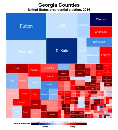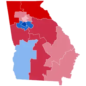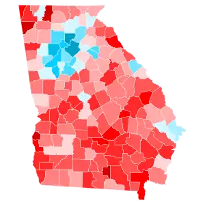 Trump won Georgia by 5.13%, a smaller margin than Mitt Romney's 7.82% in 2012 and even John McCain's 5.20% in 2008. Clinton received 45.64% of the vote, making this one of the few states where she outperformed Barack Obama in 2012, when he received just 45.51% of the vote.[3] This, combined with Trump's reduced margin of victory, made Georgia one of eleven states (plus the District of Columbia) to vote more Democratic in 2016 than in 2012.[4]