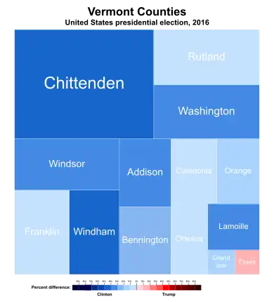 Clinton won Vermont with 55.7% of the vote and[1] a vote margin of 25.9%, a substantial decline from Barack Obama's 35.6% margin in 2012.[2] Trump received 29.8% of the vote statewide and carried Essex County—the most rural and sparsely populated county in the state, thus making him the first Republican presidential candidate to win a county in Vermont since George W. Bush in 2004.