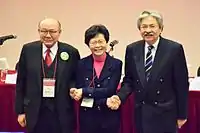 Professionals and activists formed a loose coalition called "Democrats 300+" hoping to snatch over 300 seats in the Election Committee Subsector elections based on the common platform of opposing Leung Chun-ying's second term, many of whom adopted the slogan "ABC" (Anyone but CY).[40] The camp decided not to field a candidate in the election, but rather boost the chances of an alternative establishment candidate.[41] On 9 December, two days before the election, Leung surprisingly announced he would not seek re-election, citing his daughter's ill health, which made him the first Chief Executive to serve only one term.[31] After Leung's announcement, Chief Secretary for Administration Carrie Lam, who previously said she would retire, expressed that she would have to reconsider running for Chief Executive in order to continue Leung's policies.[42]