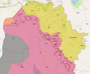 The 2017 Iraqi–Kurdish conflict, also known as the Kirkuk crisis,[17][18] was a conflict in which the Iraqi government retook disputed territories in Iraq which had been held by the Peshmerga since ISIL's Northern Iraq offensive in 2014. The conflict began on 15 October 2017 after tensions arising from the Kurdistan Region independence referendum of 25 September. The tension between the federal Iraqi government and Kurdistan Region escalated into conflict when the Peshmerga ignored repeated warnings to return Kirkuk to Iraqi government forces.[19] Part of the conflict was the Battle of Kirkuk, when Iraqi forces routed Peshmerga forces from the city in a surprise dawn-offensive, marking the beginning of clashes. [20]