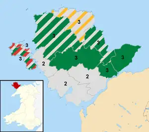 ![]() Map showing the results of the 2017 Isle of Anglesey Council elections. Striped wards have mixed representation. | |||||||||||||||||||||