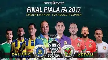 The 2017 Malaysia FA Cup Final was the 28th final of the Malaysia FA Cup, the Malaysia football cup competition.[1] Kedah won the cup after defeating Pahang 3–2 and were assured a place for the 2018 AFC Cup group stage.