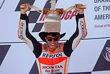 Marc Márquez, holding his first place trophy on the podium after winning the MotoGP race.