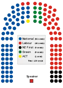 The National Party won a plurality of the seats with 56, down from 60 in 2014.[6] Labour made large gains following Jacinda Ardern becoming the party leader seven weeks prior to the election, increasing its representation from 32 to 46 seats. Labour was the only parliamentary party to gain support but a large portion came at the expense of the Green Party, who lost almost half their seats (dropping from 14 to 8) following co-leader Metiria Turei's resignation over self-admitted benefit and electoral fraud. The anti-immigration populist party New Zealand First won 9 seats, down from 12 in 2014. ACT retained its one seat. Election-night counts had National with 58 seats, Labour with 45 seats, and the Greens with 7 seats, but when special votes were counted, National lost one list seat each to the Greens and Labour.[7][8]