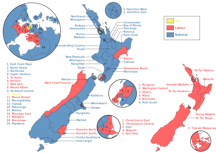 ![]() Map of the general election. Electorate results are shown on the left, Maori electorate results in the centre, and the list members on the right. | |||||||||||||||||||||||||||||||||||||||||||||||||||||||||||||||||||||||||||||||||||||||||||||