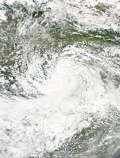 Dhaniakhali of Hooghly district and Ghatal in West Midnapore district were the two worst affected areas. 1,79,321 hectares out of 10,82,285 hectares of paddy seedbeds were damaged.[7] At least 50 people died while nearly 20 lakh (2 million) were affected in over 160 villages, which were inundated due to heavy rains. 2,301 people were evacuated from their houses and 2,02,957 hectare of agricultural land was submerged. Around 7,868 houses were entirely destroyed while 44,361 were partially damaged in West Bengal.[8][9] The state lost around Rs.553 crores(US$86.6 million) due to the storm.[10] An additional eleven people were reported to be killed in Jharkhand due to heavy rains.[11]