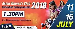 The 2018 Asian Women's Club Volleyball Championship was the 19th edition of the Asian Women's Club Volleyball Championship, an international volleyball club tournament organised by the Asian Volleyball Confederation (AVC) with the Volleyball Federation of the Republic of Kazakhstan (VFRK). It was held in Ust-Kamenogorsk, Kazakhstan from 11 to 18 July 2018. The tournament served as the Asian qualifiers for the 2019 FIVB Volleyball Women's Club World Championship with the champion qualifying for the World Championship.[1][2]