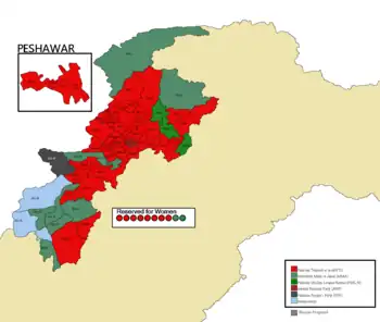 General elections were held in Khyber Pakhtunkhwa on Wednesday, 25 July 2018 to elect the 51 members of 15th National Assembly from Khyber Pakhtunkhwa. The Pakistan Tehreek-e-Insaf (PTI) obtained a landslide victory in the province by winning 37 general seats and increased their margin of victory from 2013. The PTI also won 8 out of 10 reserved seats while the Pakistan Muslim League (N) (PML-N) and Muttahida Majlis-e-Amal (MMA) won 1 reserved seat each.[1]