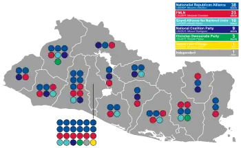 | Department | ARENA | FMLN | GANA | PCN | PDC | FPS | CD | PSD | Ind | |||||||||||||||