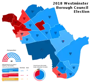 ![]() 2018 Westminster Borough Council Election Results Map. Conservatives in blue and Labour in red. | |||||||||||||||||||||||||