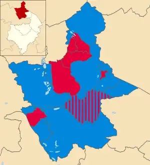 Both the Conservative and Labour parties saw increases in their vote share, especially the former, which was likely due to UKIP losing nearly 20% of their vote share. The Conservatives lost one seat to Labour but still retained a majority of seats.[1][2]