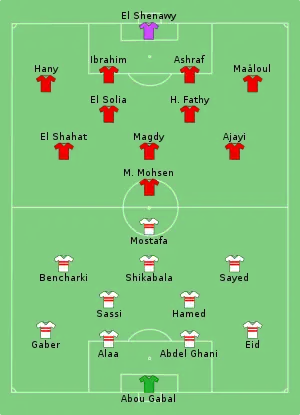 El Solia opened the scoring for Al Ahly in the 5th minute with a downward header from four yards out a corner on the right. Shikabala equalized for Zamalek in the 31st minute when he cut in from the right before shooting left-footed form the edge of the penalty area to the top left corner of the net past Mohamed El Shenawy who did not move.[20] Magdy got the winning goal for Al Ahly in the 86th minute when he controlled the ball on his knee after it was cleared by Mahmoud Alaa, before volleying to the right corner of the net with his right foot from outside the penalty area.[21]