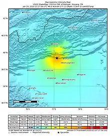 The 2020 Kashgar earthquake, also known as the Jiashi earthquake occurred on 19 January 2020 at 21:27:56 China Standard Time in Xinjiang Province, China. According to the United States Geological Survey, the earthquake had a moment magnitude of 6.0 and a surface wave magnitude of 6.4 according to the China Earthquake Network Center.[1][5] It struck at a shallow depth of 5.6 km according to the USGS while the CENC has the figure at 16 km. Local emergency management agencies said the earthquake damaged more than 1,000 homes and businesses in the nearby populated towns and villages. One person is known to have died while two other children were injured.[6][1]