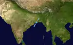 After 3 months of inactivity, on October 11, a depression developed over the west-central Bay of Bengal, though the system was originally observed near the Spratly Islands over the South China Sea on October 6. It continued to move westwards, making landfall in the Khánh Hòa province and further weakened into a low pressure cell while crossing the Indochina Peninsula and re-emerged in the Andaman Sea on October 9. It intensified into a well-marked low-pressure area and then into a depression over the Bay of Bengal on October 10. It further intensified into a deep depression on October 12, remaining practically stationary over the same region.[18][19] After that, BOB 02 moved west-northwestwards and made landfall in Andhra Pradesh near Kakinada in the early hours of October 13 and weakened again into a depression.[20] The system weakened into a well-marked low-pressure area in south-central Maharashtra on the evening of October 14.[21] Though the system's lower-level circulation was partially exposed due to high vertical wind shear and continuous land interaction, the JTWC re-issued a tropical cyclone advisory on October 15. The IMD also forecasted BOB 02 to reintensify in the Arabian Sea.[22][23] The low-pressure area intensified into Depression ARB 03 on the early hours of October 17.[24]