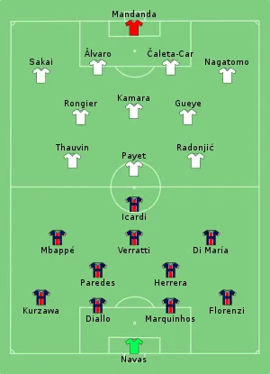 Mauro Icardi opened the scoring in the 39th minute when his header from a cross from the right was initially saved and pushed onto the post by goalkeeper Steve Mandanda, he followed up to tap in the rebound from a yard out.[9] Neymar made it 2–0 in the 85th minute with a penalty, sending the goalkeeper the wrong way to shoot into the right corner of the net after Mauro Icardi had been brought down by Yohann Pelé.[10] Dimitri Payet got a goal back for Marseille in the 89th minute when he finished to the left corner of the net from six yards out after a low cross from the right.[11]