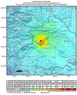 The earthquake had a magnitude of 5.3 Mw and a depth of 10 kilometres (6.2 mi) according to Advanced National Seismic System[1] and 5.5 ML according to the Seismological Service of Croatia.[2] The maximum perceived intensity was VII (very strong) to VIII (damaging) on the Medvedev–Sponheuer–Karnik scale (MSK)[15] and VII (very strong) on the European macroseismic scale (EMS-98).[16] It was the strongest earthquake in Zagreb since the earthquake in 1880.[8][17][18][19][20][21]