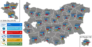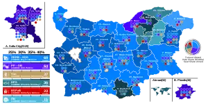 The parties which formed the previous coalition: PP, BSPzB and DB failed to gain a majority only reaching 98 of the seats. Meanwhile the two pro-Russian and nationalist parties VAZ and the new formed Bulgarian Rise (led by former interim prime minister Yanev) both made gains.[39] GERB became largest party with around 25% and 67 seats. ITN failed to reach the 4% threshold.[40]