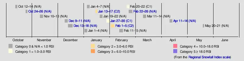 Based on the astronomical definition, winter began on the winter solstice on December 21, 2021 and ended on the spring equinox on March 20, 2022.[1] Based on the meteorological definition, the first day of winter started on December 1 and the last day was February 28.[2] These dates historically describe the period in each year when winter storms are most likely to occur. However, winter storms may occur outside of these limits, as shown by the early formation of this season's mid-October winter storm on October 12. Since both definitions of winter span the start of the calendar year, it is possible to have a winter storm spanning two different years. In addition, major winter events can occur well after the official start of spring, as close as June in some cases, as shown by a very late-season winter storm that impacted Colorado in late May 2022 with heavy snow following warm temperatures just a day beforehand.