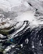 Farther north, in Iceland, news about the storm were dispatched across the country's people as a preparation.[75] The south and western parts of Iceland were also placed under an orange warning by the Icelandic Meteorological Office by 5 January.[76] The Icelandic Coast Guard also alerted vessels and fishermen in ports regarding the brunt of it.[77] Icelandair also canceled some flight operations by that day owing to the storm.[78] In the southwest portion of the country, rescue teams were reported to have been responding to the calls by the citizens there regarding the impact of the storm. Across Reykjavík, they responded to flying roofs of different houses and establishments. Suðurnes (Southern Peninsula) and Vestmannaeyjar (Westman Islands) were also severely affected. A hut was also blown away by strong winds in Vatnsleysuströnd.[79] The country's eastern portion meanwhile, was battered by rough waves from the storm. Harbours at Hafnarhólmur sustained "biggest" damages, as well as some vessels docked there. Rocks from the shores also pushed over the area's roadways; this was cleaned up subsequently.