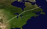 A nor'easter exited the east coast of the United States on January 4, producing snowfall from Alabama to New England, with as much as 6.0 inches (15 cm) accumulating in Huntsville, Alabama and 6.9 inches (18 cm) falling at Ronald Reagan Washington National Airport.[58][59] A peak snowfall accumulation of 15.5 in (39 cm) was recorded in Huntingtown, Maryland.[60] Many vehicles and motorists across Interstate 95 in Virginia were stranded due to the snow, with some of them for 24 hours. Over 1,000 motor crashes were also reported and assisted by the state's police. It also caused 3 people to die in a car crash in Maryland.[61] Two others died in the winter storm, one each in Tennessee and Georgia, bringing the total up to 5.[62] Snow even fell as far south as Fort Walton Beach, Florida, where temperatures dropped from 75 °F (24 °C) to 34 °F (1 °C).[63] Thousands of flights were canceled in the eastern United States.[64] At the Baltimore Washington International Airport, a ground stop was temporarily instituted.[65] This storm came after a day of record high temperatures; the temperature in Huntsville, Alabama the day before the storm (January 1) was 79 °F (26 °C), a record for January.[66] The winter storm was unofficially named Winter Storm Frida by The Weather Channel.[67] It also caused 343,000 power outages in Virginia and 42,000 in Maryland.[68] North-central, northeast and northwest portions of Georgia were placed under winter storm warnings by the National Weather Service there on 1 January.[69] Over 59,000 household customers lost electricity across Charlotte City, with 159,000 overall over the Carolinas. Some establishments were completely wrecked by the strong winds the storm brought, and trees were reported to have been downed.[70][71] This further rose to 211,000 by 3 January and lessened to 2,500 as rescue teams started working to restore electricity.[72] In Ellendale, Delaware, 14.5 inches (37 cm) of snow fell on 3 January.[73] This led to a chicken house collapse on 4 January which trapped a 12-year-old girl.[74] According to Aon Bonfield, damage from the storm reached $495 million.[57]