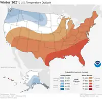 On October 21, 2021, the National Oceanic and Atmospheric Administration's Climate Prediction Center released its U.S. Winter Outlook for the upcoming winter.[4] The temperature and precipitation outlooks reflected a typical La Niña weather pattern during the winter. Significantly above-average temperatures were forecasted across the Southern Tier, especially in the Southeast, with slightly above-average temperatures forecast in the Ohio Valley and Northeast. Near to below-average temperatures were expected in the far northwestern U.S. Below-average precipitation was expected across the far Southern Tier, with particularly in the Southwest, with above-average precipitation forecast in the far Northwestwern U.S., as well as the Ohio Valley and surrounding regions. Near-average precipitation was expected in the Central U.S., Northern Plains, and Northeast. Drought was forecasted to improve and end in the Pacific Northwest, while it was expected to develop or worsen across the Southwest. Drought was not expected in the eastern half of the country.[4]
