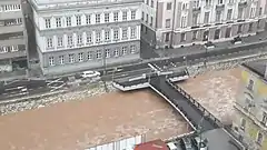 The capital Sarajevo was impacted by the floods the most.[5] The main roadways in Sarajevo were under water, causing traffic slowdowns. The flooding hit Otes the most. Many houses were flooded and some cars were stuck in the water. Firefighters, the police, the Agency for Civil Protection of the Sarajevo Canton (as well as the municipal agencies), and volunteers managed the situation. There was a shortage of manpower and not all affected objects were quickly helped.[6] Traffic between Otes and the rest of the city was cut off by the floods.[7] The rivers Željeznica and the Tilava flooded Butmir and Gornji Kotorac, where tens of objects were affected. The bridge Most spasa (Salvation bridge) connecting Butmir and the neighbourly settlement Sokolović Kolonija was submerged.[8] There had been traffic obstructions on the routes connecting Boljakov Potok, Pofalići, and Stup.[9] Floods were contained in Stari Grad owing to high responsiveness and cleaning of surface drains.[10] Schools were closed in Ilidža, where volunteer actions to set up sandbags took place.[11] The rivers were slowly receding to their riverbeds between 6 and 11 November.[12]