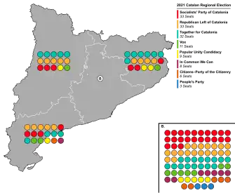 Pro-independence parties gained a majority of the votes for the first time in an election and increased their parliamentary majority, though they lost over 600,000 votes from the previous elections amidst the lowest voter turnout in history, at just 51.3%.[15][16] The PSC under Salvador Illa emerged as the largest political party in a Catalan regional election in both votes and seats for the first time in history. The far-right Vox placed fourth and entered Parliament for first time, winning 11 seats, to the collapse of both Citizens (which placed first in the previous election and fell to seventh, losing 30 seats) and the People's Party (which worsened its 2017 result, already its worst in history). The Catalan European Democratic Party (PDeCAT), the successor of the once-dominant Democratic Convergence of Catalonia (CDC), lost parliamentary representation after they failed to clear the electoral threshold. PDeCAT's extraparliamentary performance partially overturned the record for wasted votes (in vote share, but not raw votes) that had been set by CDC's erstwhile coalition partner, the Democratic Union of Catalonia (UDC), in 2015.[17][18][19]