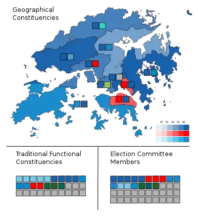 89 out of 90 elected members were the pro-Beijing establishment, with one sole moderate member in the mix represented by Third Side's Tik Chi-yuen.[12] The traditional flagship pro-Beijing party Democratic Alliance for the Betterment and Progress of Hong Kong (DAB) emerged as the biggest winner with 19 seats, by securing a seat in each of the ten geographical constituencies.[13]