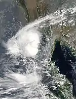 On November 3, a low pressure area entered into the Arabian Sea,[129] which formed over south-central Bay of Bengal on October 27.[130] The low pressure area later organized into a well-marked low pressure area on November 6, as the system gradually moved northwards.[131] On the next day, conditions became more favourable for further intensification, like further intensification of the MJO index, warm sea-surface temperature and moderate wind shear. Thus the system further intensified into a depression at 06:00 UTC (11:30 IST).[132] However, conditions did not allowed the system for further intensification. Thus, at 03:00 UTC (08:30 IST) of November 9, the IMD downgraded it to a well-marked low pressure area.[133] The JTWC also tracked the system, from 18:00 UTC (23:30 IST) of November 4 while located at 537 nautical miles (995 km; 618 mi) to the south-southwest of Mumbai until the same time of November 6.[134][135]