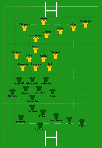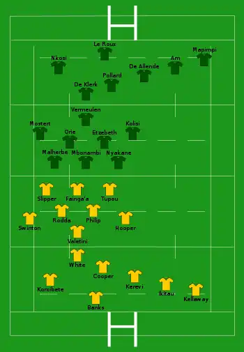 | Try: Mbonambi 27' m Marx (2) 58' c, 71' m Con: Pollard (1/2) 59' Pen: Pollard (3/5) 5', 11', 45' | Report | Try: Kellaway 16' c Con: Cooper (1/1) 17' Pen: Cooper (7/7) 7', 13', 32', 40', 52', 62', 80+1' |