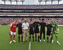 The Gunners faced fellow Premier League side Everton at M&T Bank Stadium in Baltimore, Maryland on 16 July. Gabriel Jesus and Bukayo Saka both scored one goal in the first half, helping the team win 2–0.[41] Four days later, Arsenal took on Major League Soccer side Orlando City at Exploria Stadium in Orlando, Florida. The Gunners won 3–1 with Gabriel Martinelli scoring the opener, Eddie Nketiah scoring the second, and Reiss Nelson scoring the third.[42]