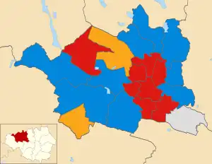 The council elects its councillors in thirds, with a third being up for election every year for three years, with no election in the fourth year.[9][10] The election will take place by first-past-the-post voting, with wards generally being represented by three councillors, with one elected in each election year to serve a four-year term.