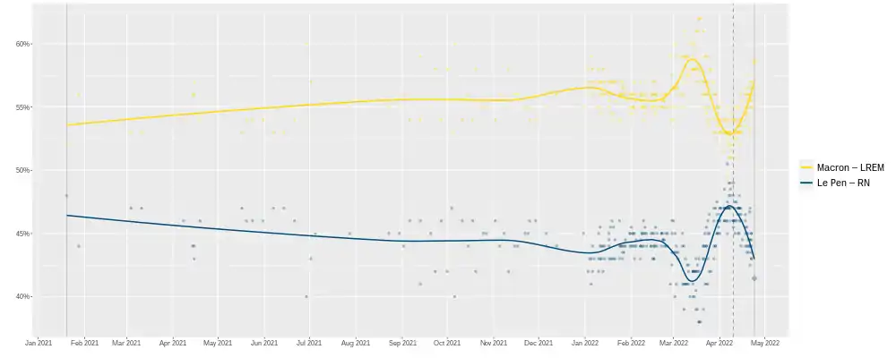 Presidential elections were held in France on 10 and 24 April 2022. As no candidate won a majority in the first round, a runoff was held, in which Emmanuel Macron defeated Marine Le Pen and was re-elected as President of France.[1] Macron, from La République En Marche! (LREM), had defeated Le Pen, leader of the National Rally, once already in the 2017 French presidential election, for the term which expired on 13 May 2022. Macron became the first president of France to win a re-election bid since Jacques Chirac won in 2002.[2]