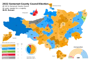 The 2022 Somerset Council election took place on 5 May 2022. It was the inaugural election of the new unitary authority, Somerset Council, which replaced Somerset County Council on 1 April 2023. All 110 councillors were elected, representing the same divisions as the old county council, but with twice as many councillors representing each.[note 1] The councillors elected first sat as members of the existing county council until its replacement by the new authority. The same councillors are now members of Somerset Council.